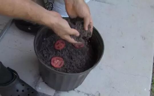 首先准备发育番茄幼苗,把家里没吃完的番茄拿来利用,要确保是成熟新鲜的番茄哦,把番茄切成1.5cm厚的切片,放进盆中用土壤掩盖好,让番茄籽可以生长发芽。