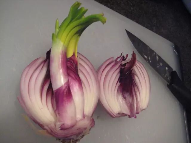 把发芽的大洋葱小心切开,留下中心发芽的部位,外层剥下来的洋葱如果还是比较硬,那还能继续吃,如果有点软了就不要吃了,因为口感不佳~