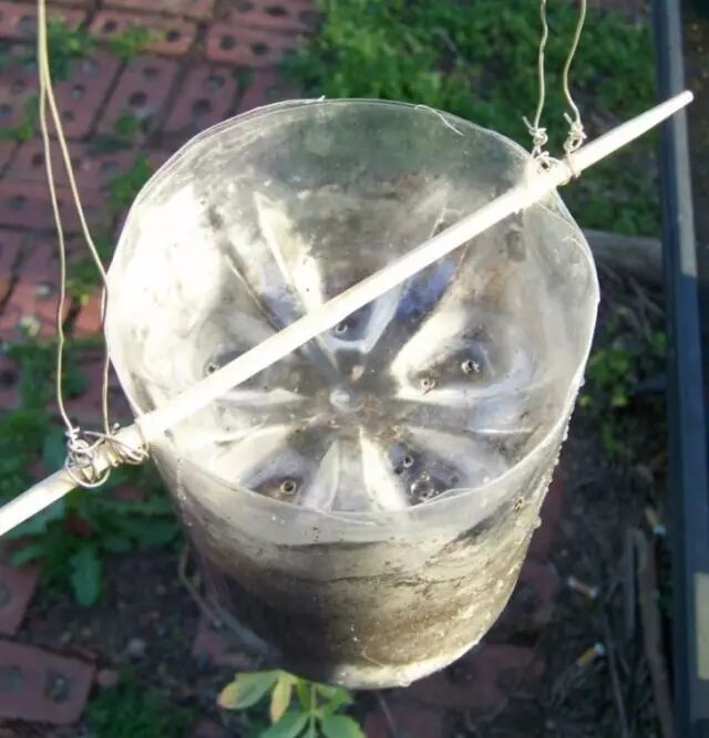 接着我们可以开始着手如何让它倒挂着长了,准备好几个大瓶子,剪切掉底部,穿上绳子,就像下面这样。