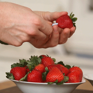 用吸管纵向穿透草莓即可取下果蒂。 0 V0 b! |0 f- @& m