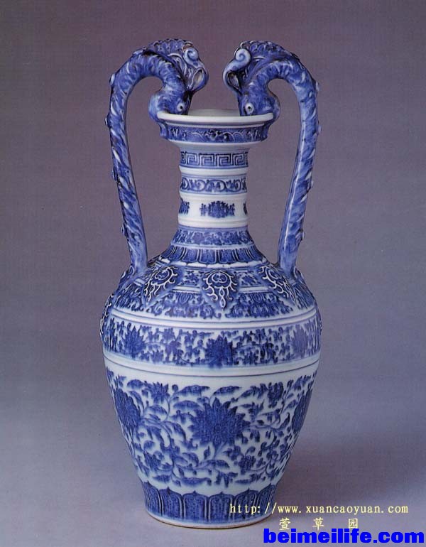 0 _; n! t/ F5 e2 M% G 图5:雍正青花缠枝花纹双龙耳瓶。北京故宫藏。/ g$ f4 t7 ]/ `( K! H% s$ A
