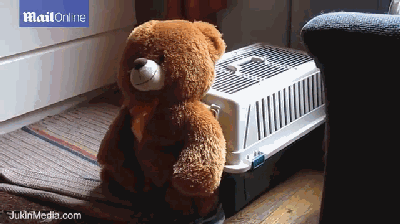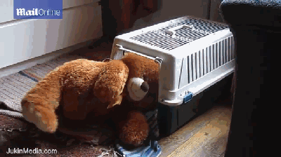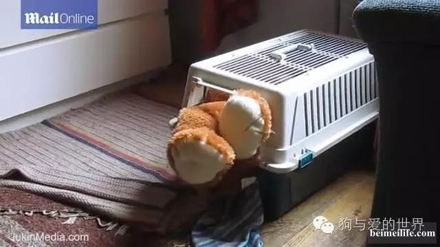 每当狗狗想睡觉的时候,都一定要自己的好朋友一起进它的航空箱睡觉。 不管玩具熊有多大,不管航空箱有多小…… 玩具熊体积要比狗大上两倍了,但狗狗一点也不在乎~。 熊:我在乎……