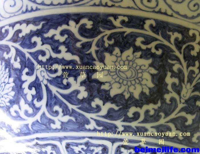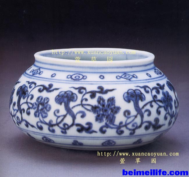 图18:洪武后期的薄釉制品。香港艺术馆展品。可以感觉“青花五彩”的艺术效果。 永宣的釉面虽然也有厚薄不均的不同施釉效果,但是都不及洪武时期的差异明显(图19),应该说,不少永宣青花的浓淡效果还是处理的不错。由于笔者也在以前不少文章中详细提及过永宣青花诸多问题,这里就不再赘言。 图19:永乐时期的青花制品。上海博物馆藏品。也可以感觉“青花五彩”的艺术效果。 五:小结 归结上文,我们可以注意到洪武时期缠枝纹饰图案造型单调统一,永乐时期因伊斯兰文化与汉文化合璧、出现阿拉伯绘画风格的缠枝造型,宣德时期又大胆创新、制作出其它新颖纹饰。以上各朝缠枝纹纹饰的使用变化都从侧面不同程度体现了该朝御厂瓷的大体制作发展情况。