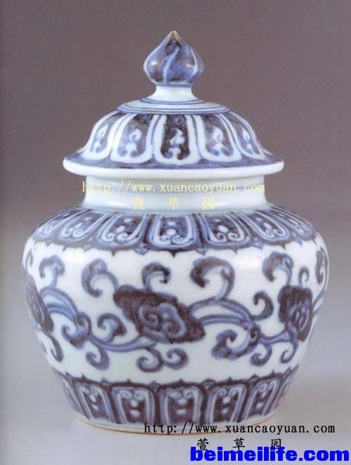 5 }' K7 u- J7 \% }, T( H八宝纹在元代青花瓷中也常见,或单独、或云托八宝纹等形式,洪武、永乐时期未曾见到宣德时期这种与缠枝莲结合的莲托八宝纹(图15)。该纹饰被崇尚佛教的后代帝王接受,并在御厂制瓷中广泛使用。 图15:宣德青花缠枝莲托八宝纹罐。北京故宫藏品。 4.其它时期 本文暂且撇开空白期,为避免内容空虚,这里简单涉及成化朝的缠枝纹情况。由于成化时期的绘画图案内容极其广泛,涉及到人物、花果、瑞兽等,丰富多彩,于是该朝中以缠枝花纹为主纹饰的制品较永宣时期又少许多,较为常见的缠枝纹有缠枝莲、缠枝莲托八宝纹等。