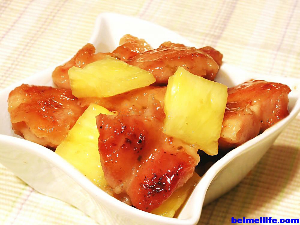 操作步骤: 一、把肉分成象女士麻将大的块儿,长宽约2公分吧,加入盐1/2茶匙、生抽1汤匙、细砂糖1/2茶匙、胡椒粉1/2茶匙、料酒1汤匙,用手抓匀,放隔夜入味,到要做菜时取出,加入2汤匙玉米淀粉、面粉1汤匙和水2汤匙,搅拌均匀,让肉块面上沾上面浆; 二、放入不粘锅中慢火煎成金黄色; 三、有煎肉的同时,腾出手兑碗汁,用一碗放水1/3碗、甜酸酱2满汤匙、玉米淀粉1汤匙、白醋1汤匙、糖适量、麻油1茶匙,搅拌均匀; 四、将菠萝切成块,用盐水泡一泡,捞起滤水备用; 五、锅置炉上,开大火,倒入碗汁烧至起大泡; 六、倒入鸡块,稍翻拌,再倒入菠萝块,翻匀即可上碟。 成品: 小提示: 一、鸡肉加适量的淀粉,可以在肉块表面产生一层膜,很吸汁,不用炸而改用煎,感觉没那么油腻; 二、甜酸汁在亚洲人柜有售。如果找不到可以用糖、白醋或柠檬汁兑也可以,甜酸度最好在煮之前用舌尖先试试; 三、碗汁加上麻油是为增香和使食物鲜亮些。 谢谢!!