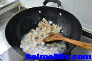 热锅凉油,大概就是一斤肉一两油的比例,倒入肥肉煸炒。-
