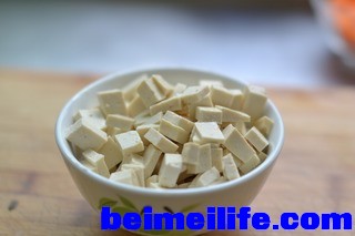 豆腐切丁(用炸过的豆腐比较好,炒的时候不会粘锅)。-