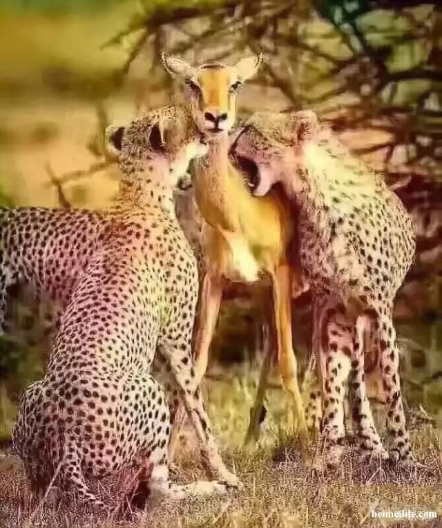 这张照片获得了最佳奖,然而摄影者却陷入了抑郁,不能自拔。 原文大致翻译: 两只猎豹追一只母鹿和两个鹿宝宝,( A( y) i4 Z I2 U2 D