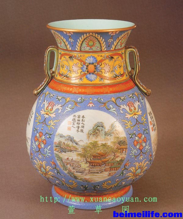 图4:乾隆蓝地粉彩开光山水转心瓶。《清康雍乾名瓷》P157,图131。
