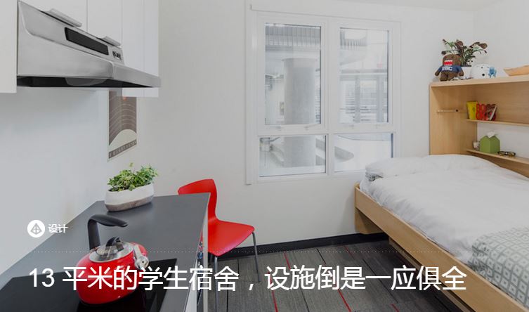 2 y. k `1 Z" m- R" n微型公寓中的又一个好设计提起学生宿舍,能够划等号的词大概有“ 空间狭小”、“没法洗澡”、“没厨房”等类似的各种烦恼。不过越来越多的学校已经开始在改善学生们的居住空间,以此作为学校招生的竞争力之一。 位于加拿大温哥华的英属哥伦比亚大学(The University of British Columbia),最近就http://vancouver.housing.ubc.ca/rooms/nano/——也可以叫做微型单人公寓,只有 140 平方英尺(13 平方米)大,但却包含了厨房、浴室、学习和睡觉的空间。