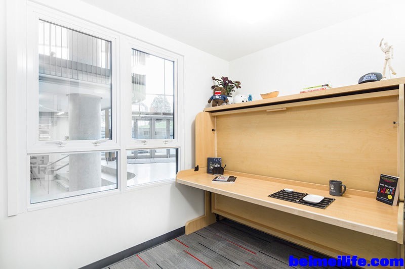 , U# n4 k2 m6 C: B而这个叫做 The Nano Studio 的学生宿舍则使用了可以折叠的木床,掀上去就变成了一张面积很大的办公桌。 % O" \( C# E7 W* R |$ J. K