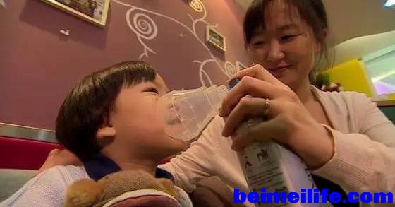 北京,一名母亲给孩子吸加拿大Vitality Air公司销售的罐装空气