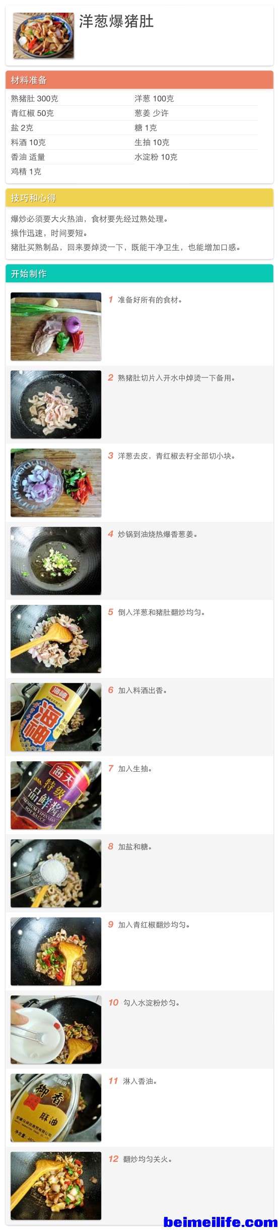- M: Q, y* D! F · 熟猪肚 300克 · 洋葱 100克 · 青红椒 50克 · 葱姜 少许 · 盐 2克 · 糖 1克 · 料酒 10克 · 生抽 10克 · 香油 适量 · 水淀粉 10克 · 鸡精 1克 % l# m F8 k, q4 e/ S5 V& X+ N* |& x