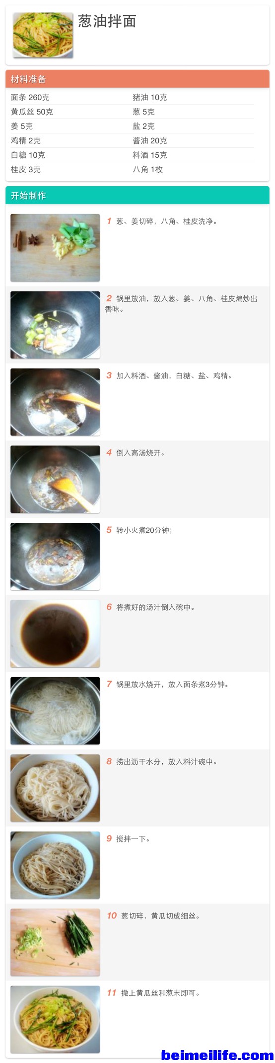 · 面条 260克 · 猪油 10克 · 黄瓜丝 50克 · 葱 5克 · 姜 5克 · 盐 2克 · 鸡精 2克 · 酱油 20克 · 白糖 10克 · 料酒 15克 · 桂皮 3克 · 八角 1枚 ) `# z; p' ]0 z6 b5 Z