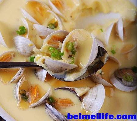 营养可口,老少皆宜。 蛤蜊蒸蛋 主料:花蛤蜊 (16只) 调料:鸡蛋 (2个)、盐 (适量)、料酒 (适量)、姜 (适量) 蛤蜊蒸蛋的做法步骤: 1. 蛤蜊用清水刷洗干净; 2. 小锅中放少许水,切几段姜丝大火煮开后放入蛤蜊煮至壳微微张开,捞出蛤蜊; 3. 将汤水去除姜丝倒入碗中(锅底剩余部分不要了,以防有泥沙)放至温热备用; 4. 3个鸡蛋打散后,按1:1或1:1.5的比例倒入蛤蜊汤水; 5. 边倒边彻底搅拌让蛋液与汤水融合后加少许盐及鸡粉调匀并过滤掉泡沫; 6. 取1深盘,铺上蛤蜊,倒入蛋液,盖一层保鲜膜(也可用相同尺寸的另一个盘子压在蒸蛋的盘子上,防止水汽进入)入开水锅中中火蒸8-10分钟至蛋液凝固,取出洒葱花及香油即可。 小贴士 1、蛤蜊蒸蛋第一步,不要用玻璃碗蒸,易碎 2、关于保鲜膜是否有毒的问题,要选择采用PMP耐高温材质的保鲜膜,该产品具有耐高温、安全无毒、透明度高的特点,买保鲜膜的时候注意下;如果对保鲜膜还是不放心,可以选择用一个略大尺寸的盘子盖在蒸蛋的容器上,也可以防止水汽进入,造成蛋羹有蜂窝。 3、高胆固醇、高血脂体质的人以及患有甲状腺肿大、支气管炎、胃病等疾病的人尤为适合; 4、有宿疾者应慎食,脾胃虚寒者不宜多吃。