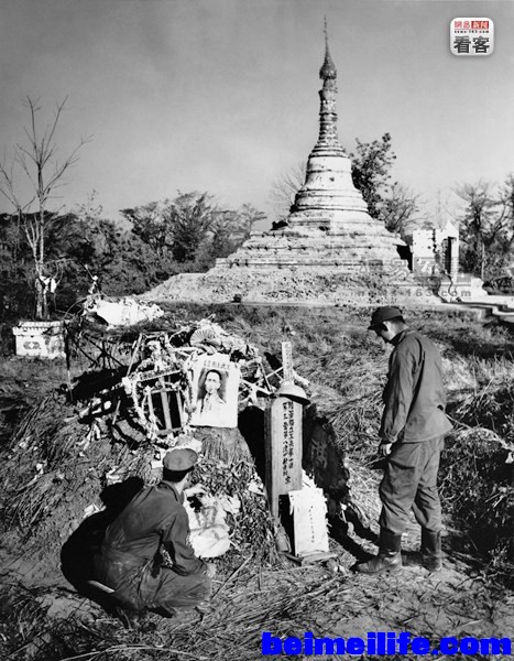 中美联军用砍刀在缅甸的崇山峻岭绵延600英里的密林中砍出一条路来向密支那发起进攻。经过11周残酷的密支那攻击战,中国驻印军和美军以伤亡6000多人的惨重代价,才艰难啃下了日军的所有堡垒。图为1945年2月10日,缅甸密支那一座佛塔前,2名美军士兵在一座泥土加草根堆成的坟前鲜花致敬,那里埋葬着他们的中国战友。摄影者:约翰.加德曼。美国战争信息办公室照片。华盛顿国防部公共关系局准予公开。