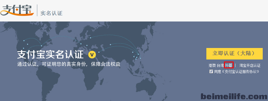 外籍用户申请个人认证流程 1、打开http://www.alipay.com/,登录支付宝账户——【账户设置】——【基本信息】,点击【立即认证】;https://certify.alipay.com/choose.htm