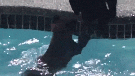 西温居民Ray Signorello周一在家里工作时,突然听到户外游泳池那传来戏水声。一开始他并没在意,以为是自己的两个孩子在玩水,过了一会儿觉得不对劲了,因为没有任何嬉笑或尖叫声。于是他抬头向外望去,看见了这一幕。。(动图,打开会有点慢哦!不过为了看萌物。。)% v/ @- i% D" y/ _- M