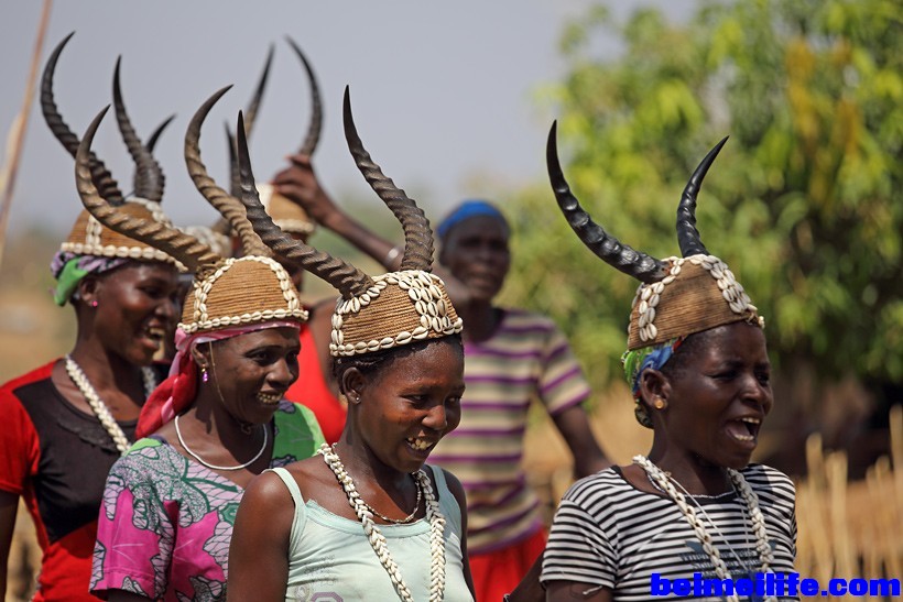 % ^$ a% ?. B5 g _& d- rTamberma (Batammariba) women wearing their traditional antelope headdress, Togo.