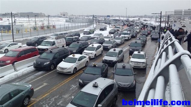 魁北克省出租车司机对“优步”的反抗愈演愈烈,星期三上午,数百名出租车司机把汽车开到蒙特利尔特鲁多机场,在抵达乘客打车的区域堵了一个多小时。3 A- A* |7 r, \7 {' e/ [