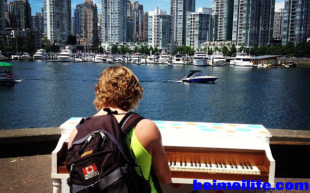背着背包的少年面对大海自弹自唱,对音乐与自然的热爱,全都随着歌声飞扬。阳光灿烂的夏天,大温的几个城市都会在不同的公共场所里摆放着免费钢琴,供游人随意弹奏。温哥华,就是这么任性,这么温暖。 0 J$ K/ C2 f0 ]* {! Q' C" J6 m% L/ L