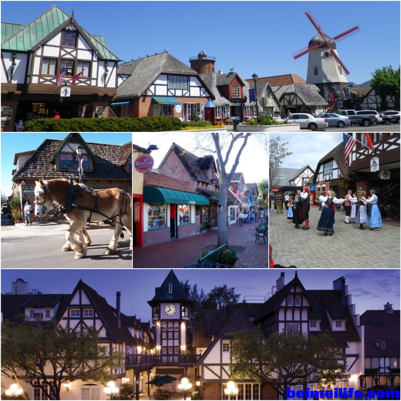 从Santa Barbara出发往北开,途中经过丹麦村,不妨驱车前往感受一下,然后继续向Hearst Castle前进。 Solvang 丹麦村: 从Santa Barbara市中心出发,往北开约34miles,45分钟,穿过一长条林荫道后,童话般的丹麦村就出现在你眼前。Solvang,丹麦语的意思就是是:洒满阳光的田园。 这里是早期欧洲移民居住的地方,仿照丹麦的街道规划了一个生活小镇。有古老的木质风车,简约的欧式建筑,沿街有礼品店、餐厅、点心店、Cafe,以及络绎不绝的游人。要说有多美多迷人,谈不上,但是在加州住久了,到这样的小镇上走走,看看不同风情的建筑,还是挺舒服的。 % o, j& R$ M( i1 a