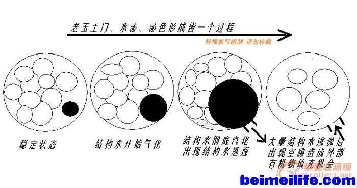 $ j3 X7 c. x) N! f+ q I【图3】就是基于这个过程的简化图示,结构水逃逸后,水从固体变成气体,体积急剧增大(水变成蒸汽体积增大的道理想象人人都懂滴),就会增大内应力,这个内应力的累积,就会找到通道甚至打开通道。而当结构水完成逃逸后,分子空隙造成的应力又会吸收能量进行填补。这时候,外部的有机物就有机会填充近来。