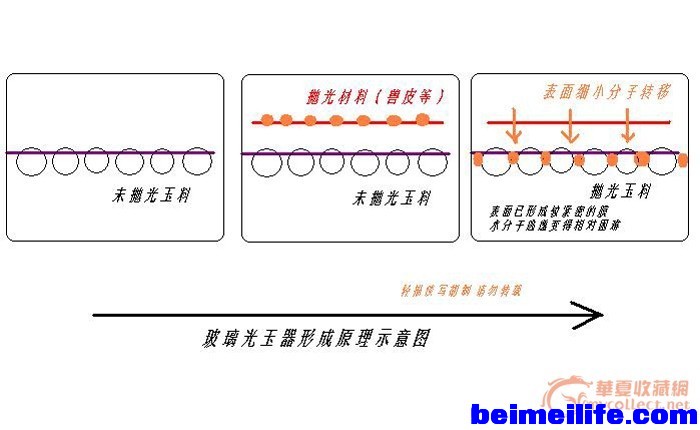 6 C) ~3 l: _8 \- I; v" y一、我们常说玻璃光玉器,大家都明白玻璃光主要是抛光的学问。我们没有办法确切知道抛光的器材是什么,但是传说中的兽皮、丝绸,都是有机分子颗粒较小的物质。我我专门画了图5,兽皮的有机分子填补了透闪石分子中的缝隙,形成一层类似膜的东西,所以内部的水分子就较难从这个抛光面上逃逸。这就是玻璃光玉器极少见到沙坑的原因。比如见到沙坑之类的玻璃光,加一万个小心不会有错。