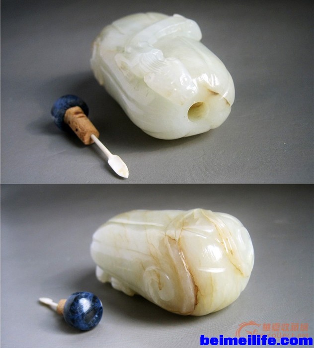 % k6 | m3 S) S4 P- B1 p/ l( _# `随便发一个清代烟壶,白玉红沁,普品而已,只是为了对应这个题目,填补一下图片的空缺而已~~~~~* _$ Y, w5 @, ]' k6 W