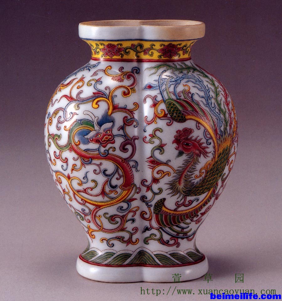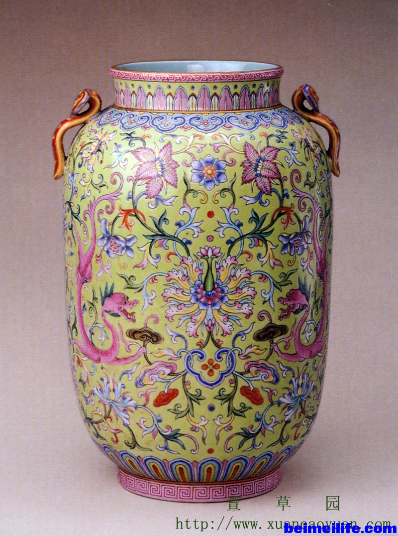 一:“龙”的起源 龙是华夏民族进入农业社会后创造的一种虚拟动物,其产生与农业对水的需求有直接关系。传说龙是善变化、能兴云雨、利万物的神异动物。春分时登天,秋分时潜渊,为众鳞虫之长,四灵(龙、凤、白虎、玄武)之首。随后,演变成为皇权象征,以致于历代帝王都以“真龙天子”自居。 二:“龙”在元明清瓷中的分类 关于龙的传说很多,《尔雅.翼》云∶ “龙者,鳞虫之长。王符言其形有九似∶头似牛,角似鹿,眼似虾,耳似象,项似蛇,腹似蛇,鳞似鱼,爪似凤,掌似虎,是也。其背有八十一鳞,具九九阳数。其声如戛铜盘。口旁有须髯,颔下有明珠,喉下有逆鳞。头上有博山,又名尺木,龙无尺木不能升天。呵气成云,既能变水,又能变火。”除此之外,随着历史变迁,演义出不少龙的造型。总之,龙在世人心中神秘、朦胧。元明清时期,统治者在景德镇建立御厂烧制宫内日用瓷,设计了大量宫廷纹饰,其中所用代表皇家身份的龙纹至少分为角龙、应龙、夔龙、螭龙、以及秃尾龙等数种。 三:角龙 角龙,即头上长角的龙,通常称为“虬龙”、“蛟龙”,是景德镇御厂最常使用的龙纹造型。体型可用上文“九似”来形容,如“角似鹿,眼似虾,项似蛇,腹似蛇,鳞似鱼,爪似凤”等。明清时期,五爪龙纹被官方垄断,代表帝王,民窑不可使用。 元朝制品中的角龙凶猛生动,基本为三爪(图1)、四爪与五爪(图2)。明初洪武永乐朝的角龙造型仍与元代大致相仿(图3),至宣德时期,龙纹显得更加粗犷威武(图4),明中期又趋于精细纤秀,明末则大多显得草率羸弱。清代龙纹整体发展与明代整体类似(图5),甚至与整个社会的政治、经济发展走势有不少瓜葛。总体看,历代角龙造型各有其时代特点,根据鳞片、爪形以及头部等诸多细节,基本可以判断出大致制作时期。 图1.元青花牡丹双龙纹罐。高28厘米,口径23.3厘米,足径18厘米,北京故宫藏。 图2.元青花龙纹围棋罐。1988年出土于景德镇珠山北麓风景路。 图3.永乐青花龙纹盖罐。通高31.5厘米,1994年出土于景德镇珠山。 图4.宣德青花云龙波涛纹圆钵。高12.3厘米,台北故宫博物院藏。 图5.雍正青花云龙纹尊 高58.3cm,北京故宫藏。 四:应龙 “应龙”指有翼的龙,俗称“翼龙”、“飞龙”。汉代淮南王刘安的《淮南子.览冥训》中记载女娲炼五色石补天后:“乘雷车,服应龙,骖青虬,援绝瑞,席萝图,络黄云,前白螭,后奔蛇,浮游消摇,...... 。”《吴志·吾粲传》中也曾提到:“夫应龙以屈伸为神,凤皇以嘉鸣为贵。”随着对应龙不断的神化,清康熙年间东轩主人又在《述异记》中渲染:“虺五百年化为蛟,蛟千年化为龙,龙五百年为角龙,角龙千年方为应龙。” 应龙的图案纹饰较早就出现在古代铜、玉、漆器以及石雕、绘画当中。南宋时期,浙江龙泉窑制作中曾出现过它。官窑瓷中应龙的出现略有些晚,明初永宣御厂瓷迅速发展阶段,应龙纹才与其它绘画素材一起纳入御厂瓷纹饰中。明代著名史学家焦竑在《玉堂丛语·文学》中记载:“景陵(宣德葬于景陵,所以此处代宣德)一日禁中阅书,见龙有翼而飞者,讶之。遣问之阁中,三杨辈皆不能对,上顾诸史官曰:‘有能知之者否?'陈继时在下列,出对曰:‘龙有翅而能飞,曰应龙。'问所在,曰:‘见《尔雅》。'命取《尔雅》视之,信然。”由此可以推测,应龙纹应是该事发生后才出现在宣德官窑瓷纹饰中。 宣德、成化时期,应龙纹使用较多,虽然成化朝继承延续了宣德朝纹饰(图6),但也带有自己的风格(图7)。根据当时双足与飞翼特点,应龙纹可以进一步分为“双足三爪羽翼类”、“鳍足羽翼类”、“双足龙爪蝙蝠翼类”、以及“鳍足蝙蝠翼类”等多个种类。清朝建立后,应龙纹制品不多(图8),御厂多仿制明代宣德、成化名品,较少创新制作本朝特色的应龙器物。 图6.明初无款青花应龙纹罐。1989年香港苏富比拍卖品,高:24.4cm。 图7.成化斗彩应龙纹天字罐。1987年出土于景德镇珠山。 图8.康熙矾红彩应龙纹天鸡高足盖碗。北京故宫藏品。 五:夔龙 战国初年至汉代初年成书的《山海经·大荒东经》中介绍过一种神兽:“东海中有流坡山,入海七千里。其上有兽,状如牛,苍身而无角,一足,出入水则必有风雨,其光如日月,其声如雷,其名曰‘夔'。黄帝得之,以其皮为鼓,橛以雷兽之骨,声闻五百里,以威天下。”还有古代文献说夔是蛇状怪物,如东汉许慎的《说文解字》中解释:“夔,神魅也,如龙一足。”总之,“夔”因似龙而被称为“夔龙”。 夔龙纹在宋、元、洪武、永乐官窑中也都没有发现,最早绘画夔龙纹的御厂瓷仍是宣德制品(图9)。从器物纹饰看,当时的夔纹造型清晰,无鳞、有兽状双足。为区别其它夔纹,可称其为“兽足夔龙”。宣德夔龙具备猪嘴、双足、有翼、卷草尾等,非常接近当时的应龙纹,仅是龙身较短、无鱼状鳞片、口吐番莲而已。因为明清时期的夔龙经常口吐蕃莲,所以俗称“含花龙”。成化朝的夔龙纹除“兽足夔龙”外,还有“三爪夔龙”(即双足绘为龙状三爪)。器物种类发展到当时各种造型、釉色(图10)。清朝雍正时期,御厂还制作出“五爪夔龙”(图11、即双足绘为龙状五爪),应是由成化“三爪夔龙”纹演变而来。清朝进入鼎盛时期,曾为主图案的夔龙纹锐减,辅助纹饰的夔龙纹(图12)骤然增多,那些源自青铜、珐琅中的“拐子龙”随处可见,与各类彩釉、纹饰相互搭配,产生出许多意想不到的艺术效果。 图9.宣德夔龙