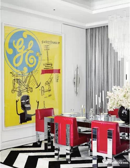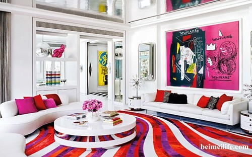 色调设置好了,就到软装环节了,在客厅里,他们选择的画是安迪·沃霍尔和让·米歇尔·巴斯奎特合作的作品《New Flame》,巨幅画作成为了视觉中心。画中的红色、紫色、白色三种颜色与同色系的地毯呼应了整个客厅空间。