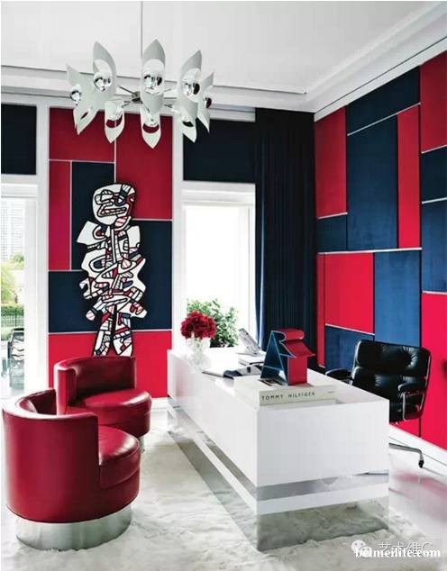 事实证明,个性如此强烈,内心如此骚包的大叔,是不会放过任何一个秀米(show me)的机会滴。在Hilfiger 的私人办公室中,这三种颜色被充分地运用到墙壁、桌椅与天棚地板。▼