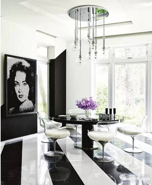 整个家的核心是它宽敞的客厅,客厅空间随着大波浪条纹图案的牛皮地毯延伸再延伸,视觉上让空间增加,猩红、莓紫、纯白,色调,条纹搭配,简直就是把品牌带回家!整个客厅靓得不要不要的,看出了夫妻俩那颗依旧年轻,活力十足的心。▼
