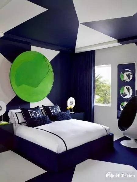 又是蓝白搭,在墙面、地面的几何组合中,绿色的大型艺术品确实压住了整个空间。海洋、绿地,好环保的感觉。▼