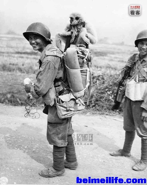 在缅甸列多公路上,1名中国驻印军独立第1个团(原为驻印军直属化学团)的士兵携带着受伤的野猴在行军。他们的主要任务是配属美军火神特种部队作战。(该部队还要美军第475步兵团)。" S3 m) c- @: f$ ]7 G