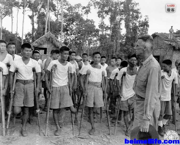 在列多公路旁的一座康复营,史迪威将军向一群中国残疾军人脱帽致敬。这些伤残军人将在这里学习编织,铁匠等职业技能以便脱下军装,重返社会。美军通信兵(U.S.Army Signal Corps)拍摄。美国战争信息办公室发布。