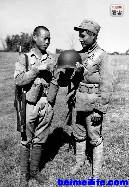 & v' S% d. O" u5 ?1945年1月23日,在缅甸南坎以东20英里的木司,中国驻印军新1军的士兵与1名中国远征军士兵相遇。中国远征军的被服是国内供应,而中国驻印军的被服是美国供应的。两者从外表来看相差极大,当时中国300个师,也只有驻印军区区几个师能有如此待遇。