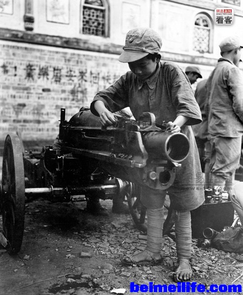 3 L: X2 e% M9 N9 I& A# e7 B通过驼峰航线运输到中国的美械装备绝大部分都配发给了中国远征军,但也有很少部分配发给了国内其他部队。图为1945年5月,在配备了部分美械之后,中国第74军将参加芷江战役。第74军的一名儿童兵在测试1门75毫米美式山炮。我们可以看到就是尊贵如中央军王牌的第74军也是草鞋兵。