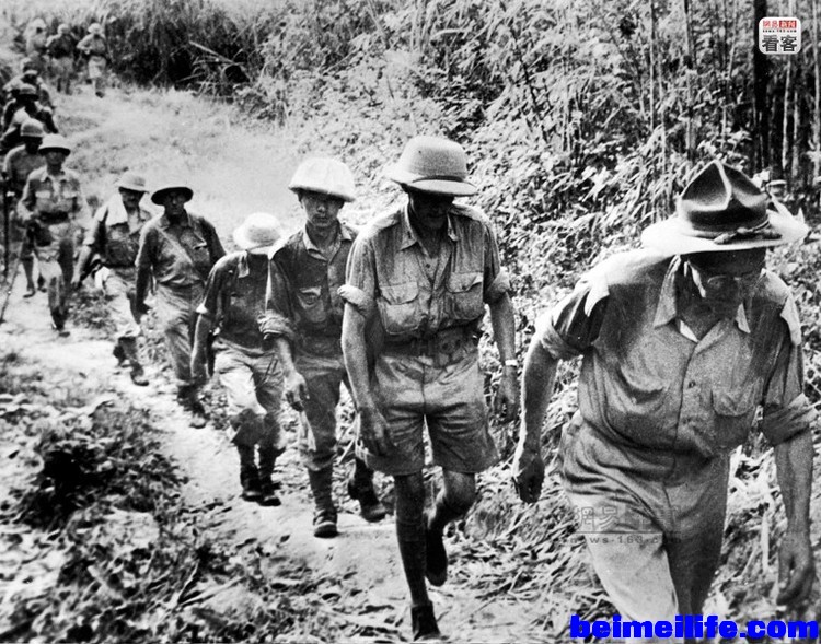 3 T7 ~, ]% y9 \' U& j- q0 |随着日军不断向缅甸增兵,并且中英军队配合混乱,英军急于向印度撤退。战况急剧恶化,1942年5月,中国远征军开始向云南和印度撤退。图为1942年5月正在缅甸丛林中带队行走的时任中国战区参谋长史迪威(前方第一人)。7 e! j* r6 z# d7 X4 |