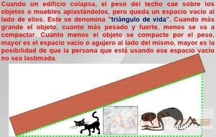 简单地说,当建筑物倒塌落在物体或家俱上的屋顶重力会撞击到这些物体,使得靠近它们的地方留下一个空间。这个空间就是被我称作的“救命三角”。物体越大,越坚固,它被挤压的余地就越小。 而物体被挤压得越小,这个空间就越大,于是利用这个空间的人免于受伤的可能性就越大。 下次,你在电视里观看倒塌的建筑物时,数一数这些形成的“三角”。你会发现到处都有这些三角。在倒塌的建筑物里,这是最常见的形状。几乎到处都有。我培训Trujillo(人口约为75万人的地方)的消防部门,教导人们如何求生,如何照顾他们的家人,以及如何在地震中援救他人。