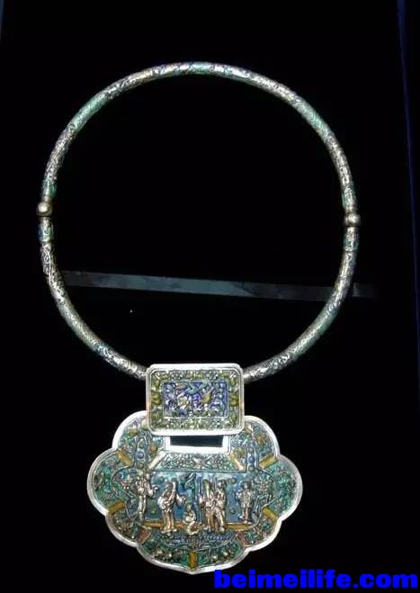 s0 W) i& A' K. L- i用金、银、铜煅制成素圈,坠有“长命锁”或“如意”之类,过去把项圈视为具有神秘力量的“衍力物”’,保佑佩者平安长寿富贵吉祥。图为珐琅彩项圈。; t6 _" ^ u" f( N; y6 ~1 e& G) G