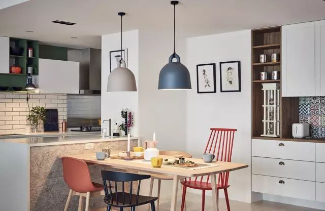 活跃的色彩让进餐区域变得轻松活泼。开放式厨房也完美的融入在大空间里。