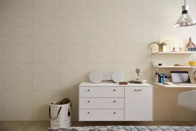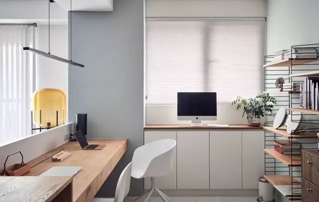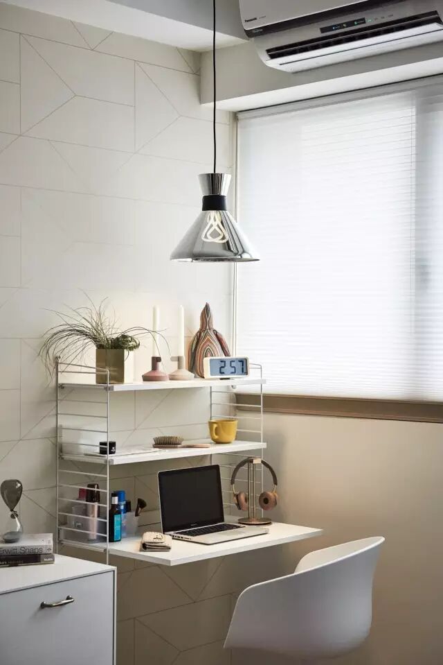 床的对面,置物柜和书桌都利用墙面悬在半空,完美利用空间,形成了一个小小的工作台,方便日常使用。