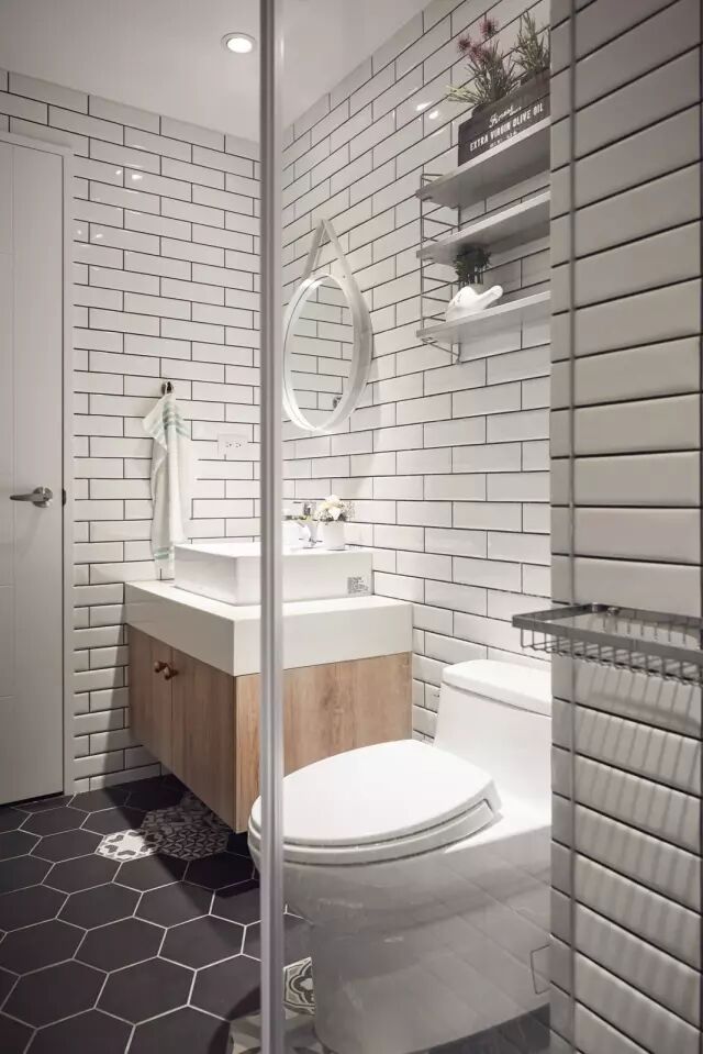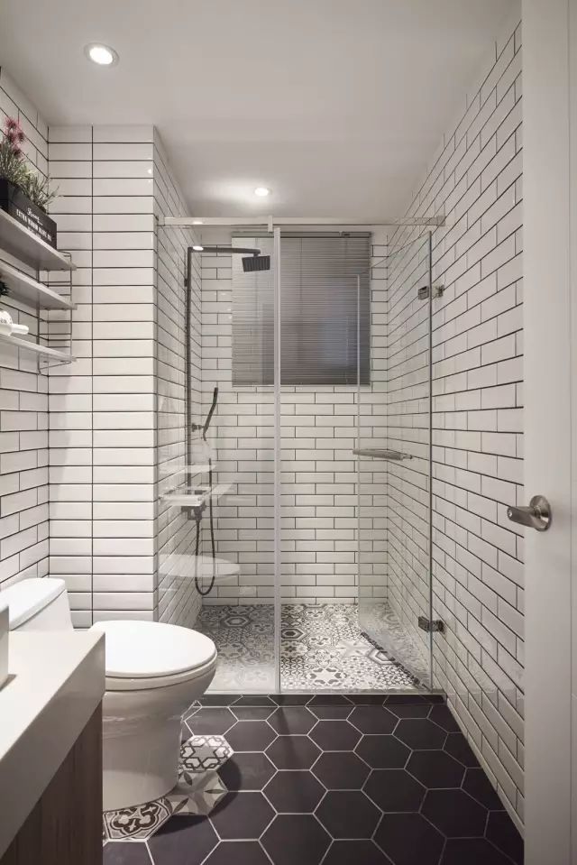 卫生间的长方形瓷砖与花色六角地砖设计给人耳目一新的感觉。