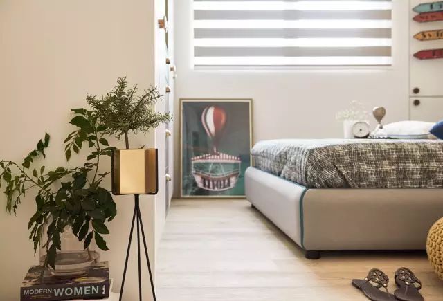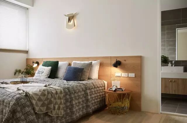 卧室采用了同样简洁自然的北欧风,床头的原木板延展出来,将开关面板和台灯安装在上面,保持了整体设计的美感。