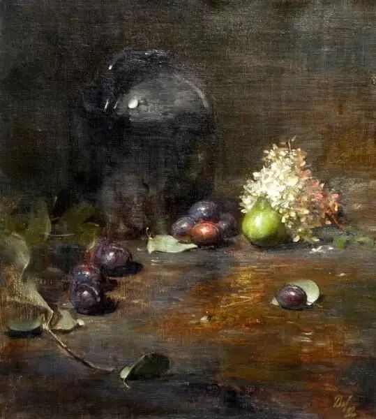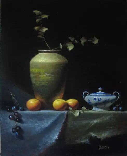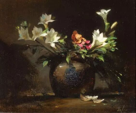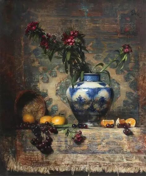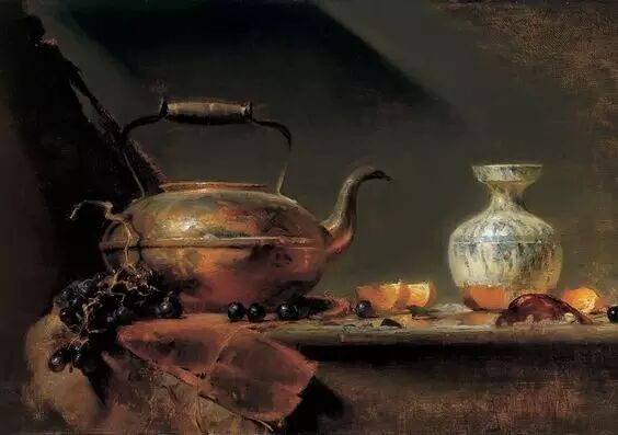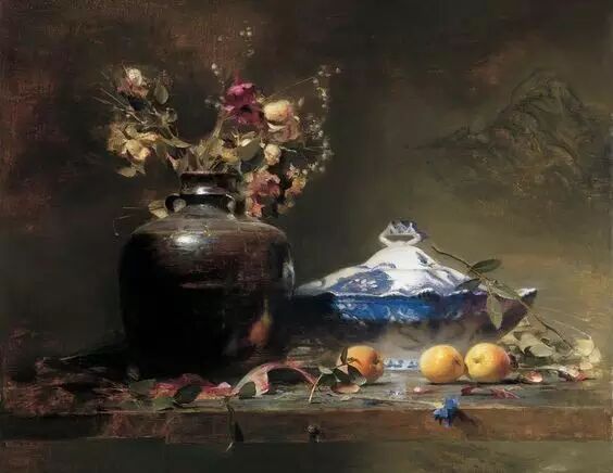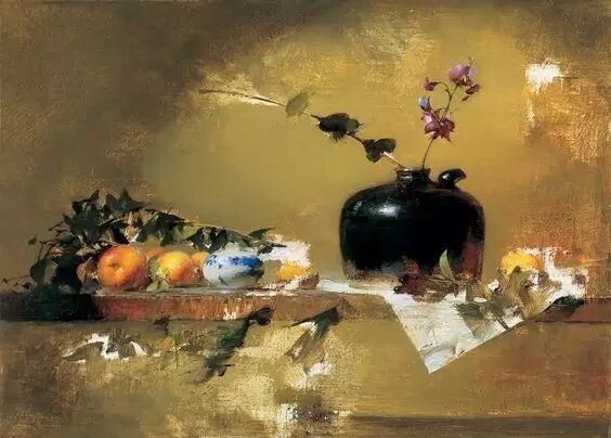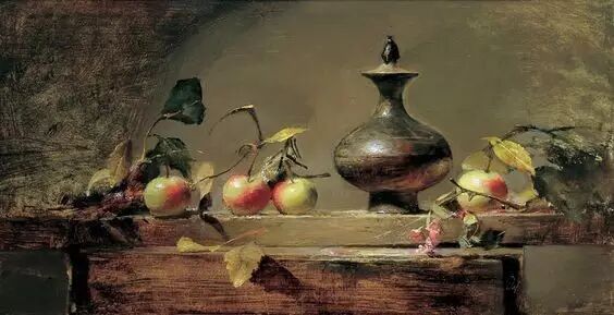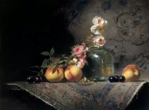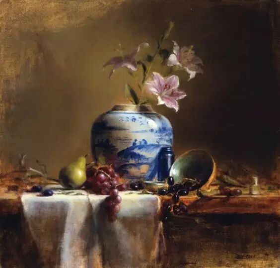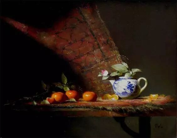 David A.Leffel是美国最具影响力的油画大师之一,他擅长大胆使用光线、光线的运动,以及创造具有灿烂强烈的生动的艺术效果。他能以令人惊讶的速度快速切入到景物的核心,构造出尚栩栩如生的陶瓷器品,鲜艳美丽的花草,带着温暖的桃子、暗紫色半透明的葡萄。