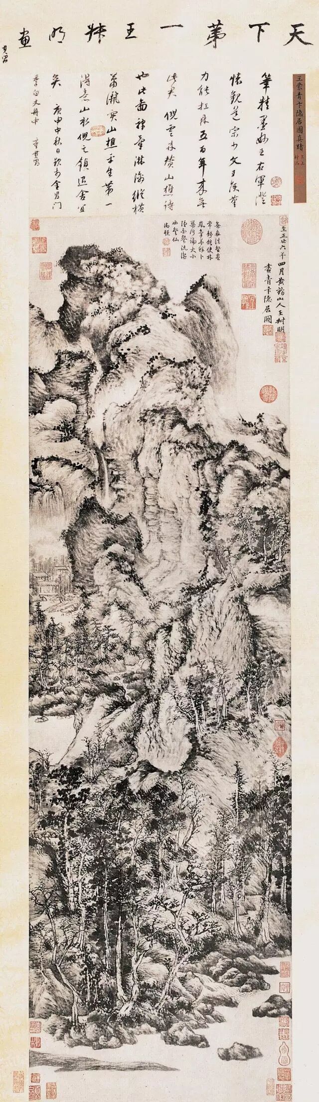 / K; ^0 q; z; ?' K整幅画运用焦墨,间浅赭色。峰峦叠嶂,楼阁参差,整个画面显得生动细腻,笔墨沉酣,不愧为王蒙的成熟代表作。画卷上方留白处,依稀可见王蒙题款,以及七位重量级名家的题诗: