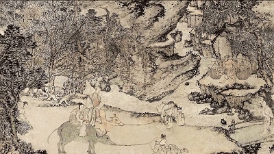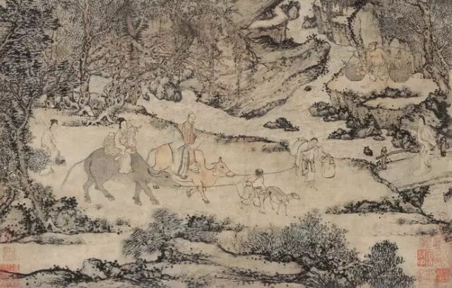 + Y1 d M# v" ~' Y7 L; y3 `《稚川移居图》描绘了东晋人葛洪携带家眷移居罗浮山,修道炼丹的故事。罗浮山位于今天广东省博罗县境内。画中骑在牛背上的葛洪是东晋道教学者、著名炼丹家。只见他身穿道袍,神情专注于手中的书卷,边走边看,全然不顾随他同行的家人。 $ b2 W) J8 C8 q* s' y( ?; m, g+ K