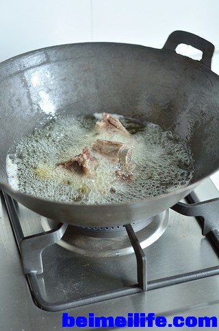 倒入炸过的猪肋排,小火翻炒。-