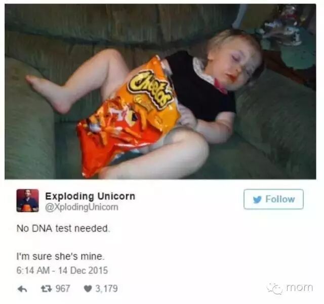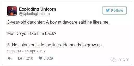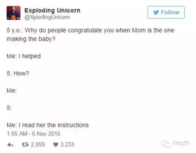 美国喜剧作家James Breakwell有4个分别为1、3、4、5岁的女儿(这妈妈也够厉害的,你懂得的)。他经常在Twitter上分享与4个女儿的爆笑对话。原来幽默会遗传,喜剧作家的女儿在搞笑方面个个都是段子手。一起来看看吧!2 P) G' j M8 i' \! [0 i